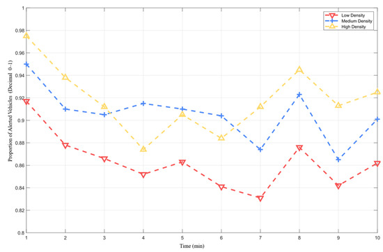 To explore the performance differences of the hybrid trust model in scenarios with varying densities, the experiment statistically analyzed the proportion of alerted vehicles in low, medium, and high-density scenarios, as shown in Figure 10. In high-density scenarios, the number of alerted vehicles is generally higher than in medium and low-density scenarios. This is mainly attributed to the high penetration rate of vehicular network messages in high-density scenarios, achieving almost full coverage. However, message conflicts in high-density vehicular networks may lead to data loss. Therefore, in some cases, the number of alerted vehicles in medium-density scenarios may be higher than in high-density scenarios.