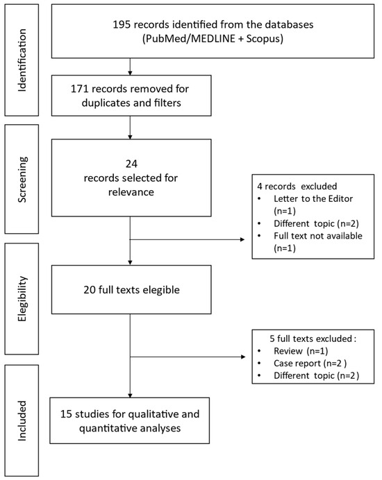 A total of 195 articles were selected by reviewing each abstract to potentially identify eligible studies. From the overall group of 195, 171 articles were removed because they were duplicates or were not related to the object of this systematic review. Four of the first selected twenty-four articles were disqualified because they were reviews or letters, dealt with distinct subjects, or lacked full texts. A total of 20 full texts were reviewed, of which 5 were further excluded. Therefore, from the systematic literature search, 15 articles were ultimately selected. The resulting PRISMA search strategy is shown in Figure 1.