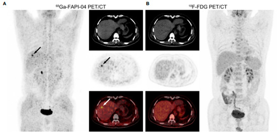 From Wang et al., PET/CT images in a 53-year-old male patient with moderately differentiated HCC. (A) 68Ga-FAPI-04 PET/CT revealed a strongly FAPI-avid lesion (black and white arrows, SUVmax = 7.36, TBR = 6.03) in the right lobe of the liver. (B) No positive finding was observed within the liver in 18F-FDG PET/CT images (SUVmax = 2.36, TBR = 1.31) [31].
