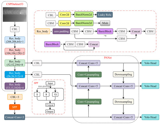 After k-means++ clustering, the anchor boxes are also optimized to improve the speed and accuracy of aluminum alloy weld defect detection. Figure 3 illustrates the improved framework of CSPDarknet53. The residual blocks are sequentially stacked through downsampling with different strides, effectively addressing the degradation problem in deep learning models and fully utilizing the semantic information from higher layers.