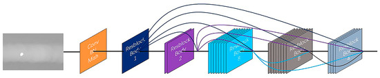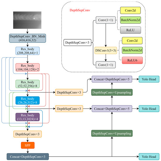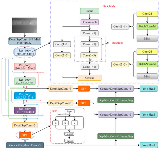 While ensuring the depth of the model, issues such as feature extraction and gradient disappearance must be carefully addressed. The YOLOv4-cs2 model improves upon the residual block structure that is based on the YOLOv4-cs1 network. Specifically, a 3 × 3 convolution is added to the large residual branch, connecting the input information with the output information from the last layer in the original residual block. This modification helps reduce the number of parameters while enhancing the extraction of local detailed features. In this study, the defects of interest include pores, slag inclusion, and incomplete penetration. Pore and incomplete penetration defects often have less edge information, which poses significant challenges for edge feature extraction. The SPP (Spatial Pyramid Pooling) layer in the original network significantly increases the receptive field and effectively separates important contextual features, playing a crucial role in the extraction of edge features from small targets. Accordingly, two additional SPP modules are incorporated into the YOLOv4-cs1 model, with these being placed after the third and fourth residual blocks, respectively. The pooling kernels of these SPP modules are set to 3 × 3, 5 × 5, and 7 × 7, enabling the network to better capture edge information. Finally, the number of channels in the model is adjusted to reduce the overall parameter count. The architecture diagram of the YOLOv4-cs2 model is shown in Figure 6.