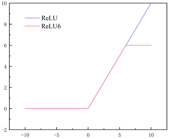 However, as the network deepens and residual blocks are continuously fused, the number of parameters that the model needs to train inevitably increases. To address this issue, all 3 × 3 standard convolutions in the PANet network are replaced with depthwise separable convolutions [25], significantly reducing the number of training parameters. Since the pore and incomplete penetration defects in the training dataset (internal defect maps of aluminum alloy welds) are small targets, downsampling in the original YOLOv4 model can lead to the loss of edge information for these defects, thereby reducing the model’s effectiveness. Therefore, the downsampling layers and corresponding feature fusion operations in the PANet network are removed to preserve more effective edge information as the network depth increases. Additionally, the ReLU activation function for all 3 × 3 depthwise separable convolutions in the PANet network is replaced with the ReLU6 activation function, as ReLU6 helps prevent numerical instability. The mathematical expressions for the ReLU and ReLU6 activation functions are provided in Equations (2) and (3), respectively, and their graphical representations are shown in Figure 4. The overall architecture of the improved YOLOv4-cs1 model is described in Figure 5.