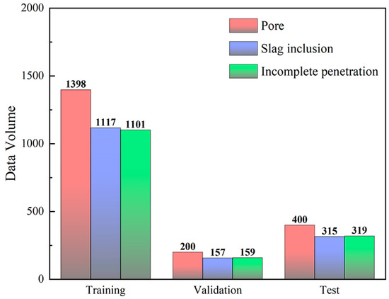 The dataset used in this experiment consists of images of internal defects in aluminum alloy welds, captured using the X-ray detection method. This is not a public dataset. The dataset includes three object classes: pores, slag inclusion, and incomplete penetration, totaling 1005 images. Given the limited number of images (1005), which is insufficient for effective training of deep learning models, data augmentation is necessary to enhance the dataset. By rotating, cropping, and adjusting the contrast of the images, the dataset is expanded to include more feature information. For example, Figure 7a–c illustrate the augmentation process for incomplete penetration defects. After using the popular annotation tool LabelMe, the dataset now comprises 5165 labeled images, as shown in the schematic diagram in Figure 8. The dataset is randomly divided into three subsets: 3616 images for training, 516 images for validation, and 1033 images for testing. Figure 9 illustrates the data distribution for different object classes across the training dataset, validation dataset, and test dataset. It is important to note that the data used for the subsequent comparison experiments were obtained from the test set. Utilizing this augmented dataset improves the robustness of the model during training.