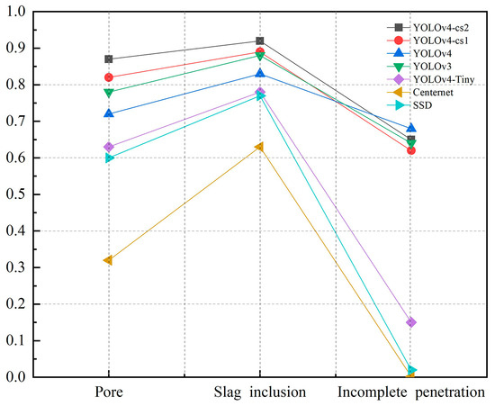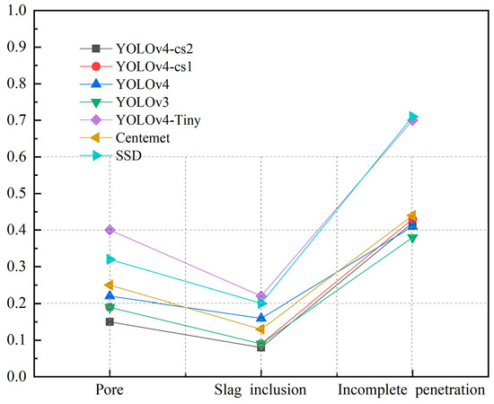 As shown in Figure 11, the missed detection rates of the YOLOv4-cs2 model for pores and slag inclusion are relatively low, demonstrating that the improved model has advantages in detecting these types of defects.