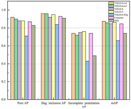 In Equation (8), AP represents the ratio of the sum of all detection accuracy rates for a specific type of defect to the total number of instances of that defect. In Equation (9), mAP represents the average of the AP values across all types of defects. The results of a comparison between different models are presented in Table 5. Figure 12 illustrates a comparison of the AP and mAP results of various models. The results indicate that the YOLOv4-cs2 model performs better, demonstrating an improved detection performance.