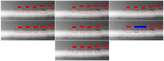 The detected defects are illustrated in Figure 13, Figure 14, Figure 15 and Figure 16, corresponding to the models listed in Table 5, from YOLOv4-cs2 to SSD, respectively. The tests primarily focus on images of pores, slag inclusion, incomplete penetration, and combinations of all three types of defects. From Figure 13, it is evident that YOLOv4-Tiny failed to detect all instances of pores, while the CenterNet model misclassified some pores as slag inclusion. In Figure 14, which shows images of slag inclusion, the SSD model incorrectly identified one region as a pore and failed to detect a small slag inclusion.