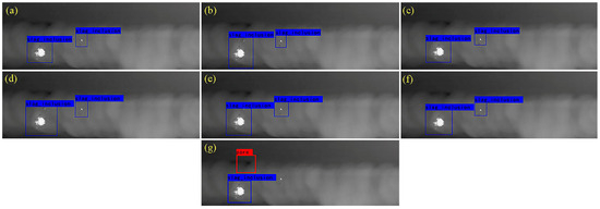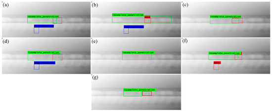 Slag inclusion (blue frames). (a) YOLOv4-cs2, (b) YOLOv4-cs1, (c) YOLOv4, (d) YOLOv3, (e) YOLOv4-Tiny, (f) Centernet, (g) SSD.