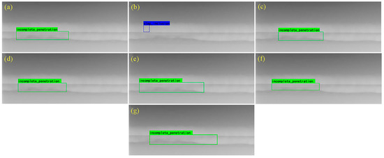 Incomplete penetration (green frames). (a) YOLOv4-cs2, (b) YOLOv4-cs1, (c) YOLOv4, (d) YOLOv3, (e) YOLOv4-Tiny, (f) Centernet, (g) SSD.
