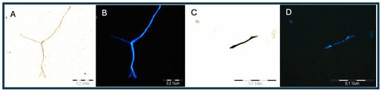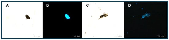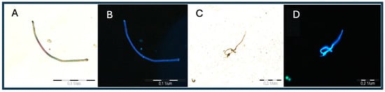 The images below show tissue arranged on a basic slide and analyzed microscopically under UV (4) and green (3) light for the initial identification of microplastics and the estimation of their amount and position for further analysis (Figure 5). Scanning in the high resolution of the eyepiece makes it possible to identify fractions; however, the resolution of the objective lens does not allow for photography at this scale. In the figures below, PE (A, B), PS (O, P), PA (I, J), and PET (K, L) are confirmed.