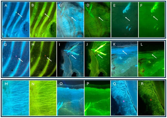 Microplastics in optical microscope images using UV light and deep green to image microplastics in different color ranges. (A–R) are areas of the same fragment in different color ranges. The arrow indicates the location of the visible microplastic particle.