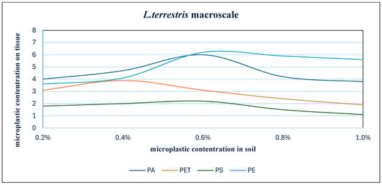This study proved that on a macroscale, earthworms that are exposed to different concentrations of particles of different polyamides have the ability to accumulate tissue in that particular range. In the case of polyamide, the molecular size in the soil was in the range of 30 µm to 1000 µm ( in the graph, for simplicity, the maximum value is 100 µm) but in the tissues, particles were only detected in the range of 33.5 µm to 60.5 µm. In the case of PET, heterogeneous particles of 10 µm to 1000 µm were found in the soil, but in the tissues, only sizes in the range of 19–71 µm were detected. In the case of polystyrene, the polymer size in the soil was 30 µm to 1000 µm and detected in the range of 37.5 µm to 64.5 µm, and in the case of polyethylene, particles from 1 µm to 90 µm were added to the soil and detected in tissues from 5 µm to 54 µm, with the detection of particles below 10 µm only being possible due to the strong fluorescence of the particles.