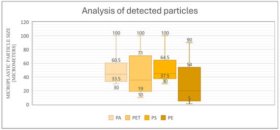 To the authors’ knowledge, this is the first study of its kind in which the authors determined the sizes of particles that were accumulated in the bodies of living organisms, relative to any that were intentionally added to the soil (Figure 10). The data shown in the diagram (diagram x) represent the minimum and maximum size of each plastic and the size range of the particles that were isolated from the tissues. This study proved what particle sizes accumulate in tissues and what the reasons for this may be.