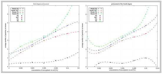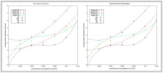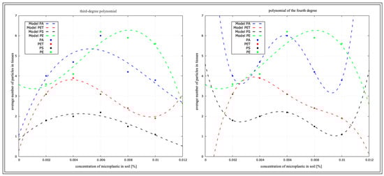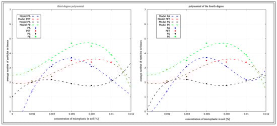 Using all the data, which are the variables of concentrations and types of plastics, we initially performed a determination analysis for the linear function and quadratic function, but with such a number of variables, the function was not sufficient, and the determination index at each analysis indicated 1. For a better and more accurate depiction of the statistical fit of the model, a third-degree power polynomial and fourth-degree polynomial analysis were performed and are presented in the tables (Table 6, Table 7, Table 8 and Table 9) and figures below (Figure 15, Figure 16, Figure 17 and Figure 18). To increase the clarity of the results, the authors used the abbreviation of the third-degree polynomial as (R2)3 and the fourth-degree polynomial as (R2)4.