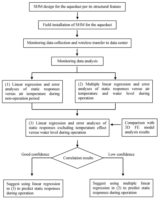 Using field monitoring data collected for over a year, this research investigates the static behavior of a typical span of a large tied-arch aqueduct under variations of air temperature and water load in an effort to predict the deformations and strains of the aqueduct during operation in order to set up a baseline for the structural safety evaluation. It serves as a feasibility study for the implementation of an SHM system for the entire aqueduct and can also provide a valuable reference for the structural monitoring of other large-scale aqueducts under similar operating conditions.