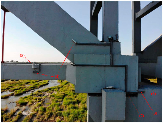 Part of the monitoring system is shown in Figure 2. The static level gauge detects the vertical displacement at its location by measuring the liquid level variation inside its chamber. Due to its work mechanism, all gauges in the same assembly set should be installed at about the same elevation. For the sake of field installation and future maintenance, two sets of static level gauges are mounted on the top of the left and right sidewalls of the trough above the composite tied-arch, and each set has one gauge at the upstream end, mid-span, and downstream end of the trough, respectively, which are designated as (1) in Figure 2. An ultrasonic water level gauge is fixed onto the side surface of the first upstream transverse link beam at the top of the trough, which is designated as (2) in Figure 2.