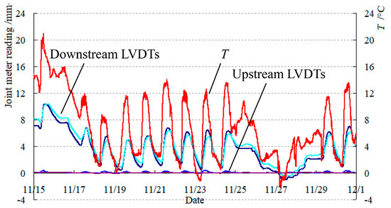 The typical variation in the LVDT readings of the expansion joints at abutments on both sides of the composite tie arch with the air temperature (hereinafter referred to as T) during a 15-day non-operation (trough empty) period from 15 November 2024 to 30 November 2024 is shown in Figure 4. It can be seen that the LVDT readings at the downstream abutment expansion joints on both sides essentially exhibit the same magnitude and variation pattern, while those at the two upstream abutments basically maintain around a near zero status due to the fixed basin-type rubber bearings at those locations. It can also be seen that the LVDT readings at the downstream abutment expansion joints are very sensitive to the air temperature, with daily maximum and minimum readings appearing almost concurrently with the daily highest and lowest air temperatures, respectively.