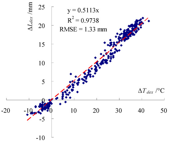 The LVDTs are initialized to 0 right after installation at a temperature of −3 °C; so, the daily extreme air temperature change (hereinafter referred to as ΔTdex) is taken as the daily highest or lowest (if lower than −3 °C) temperature minus −3 °C, and the daily extreme ΔL (hereinafter referred as ΔLdex) is calculated using the daily maximum or minimum readings of LVDTs with respect to daily highest or lowest temperatures. The relationship between ΔLdex and corresponding ΔTdex during the non-operation period from 1 December 2023 to 31 December 2024 is plotted in Figure 5, which exhibits a good correlation with a R2 of 0.9738 and a RMSE of 1.33 mm. The regression also shows a ±1 °C air temperature change tends to cause a longitudinal deformation of ±0.51 mm for the composite tied-arch.