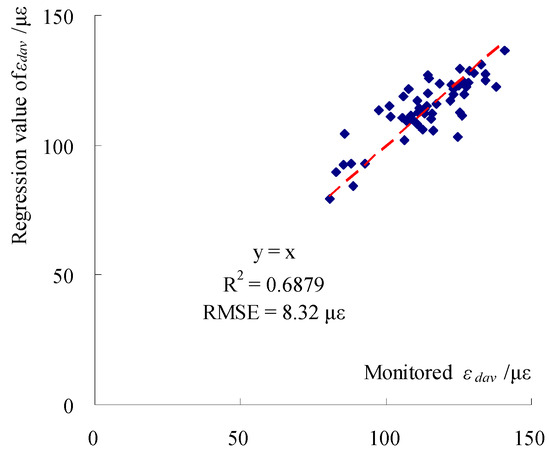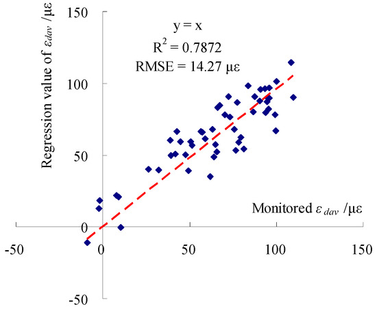 Correlation between monitored and regression values of εdav of the gauge at the mid-span of the right rod during operation.