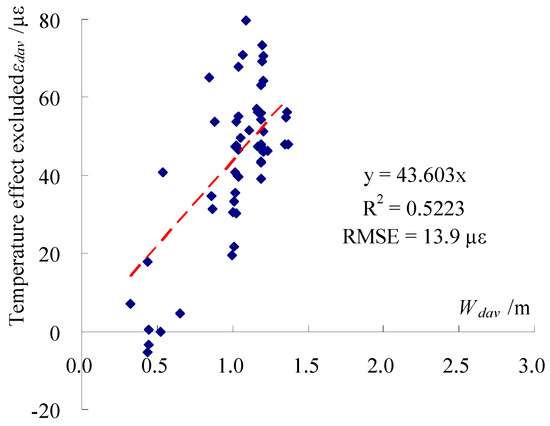 It can be seen from Table 1 and Table 2 that the correlations between εdav, Tdav, and Wdav for the gauges on arch rings during both the non-operation and operation periods of a year are generally poor and inconsistent. Therefore, when performing the isolation of the temperature effect from the monitored strains during operation, only the gauges on tension rods are selected. For each gauge, the temperature effect approximated by the regression equations in Table 1 is excluded from εdav, and then an average is taken for all gauges on the tension rods on each side, which is plotted against the daily average water level Wdav as shown in Figure 21 and Figure 22. The two figures show that the correlation of the left rod is much better than that of the right, with a higher R2 and a lower RMSE, and this may be attributed to the direct exposure of the right (south) rod to sunlight which can cause more negative temperature impact on gauge readings. The correlations also show a general trend that 1 m deep water in the trough tends to generate a tensile strain of 43.1 με and 43.6 με for the left and right tension rods, respectively.