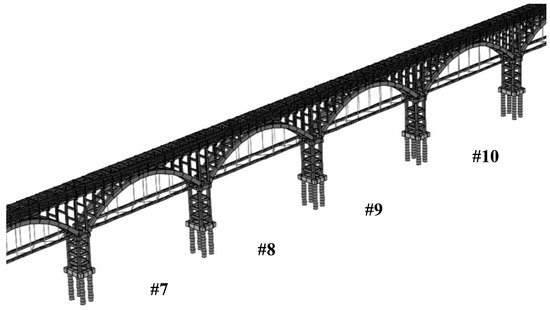 A 3D structural model of the entire aqueduct was created by SAP2000 V23.3.0. The middle part of the model is shown in Figure 23, which includes the target monitoring span—span #8. From top to bottom, the model comprises the reinforced concrete U-shaped trough segments (including 3 cm-wide contraction joints), the composite tied-arch (including post-tensioned tendons inside tension rods), transverse bent frames erected from the tied-arch, moment frame supports holding up the composite tied-arch, and pile foundations. The rubber bearings of the composite tied-arch, fixed basin-type at upstream ends, and sliding basin-type at downstream ends are incorporated in the model using link elements with shear and rotational stiffness properly defined. The non-conventional bearings made of two layers of thin asphaltic felt for prefabricated U-shaped concrete trough segments are also simulated. The structural model was verified by a comparative analysis of in situ dynamic tests and modal analysis prior to this study [19], which also provided an approximation of elastic moduli for the concrete of main load-bearing members, including the composite tie arch, transverse bent frames, and moment frame supports.