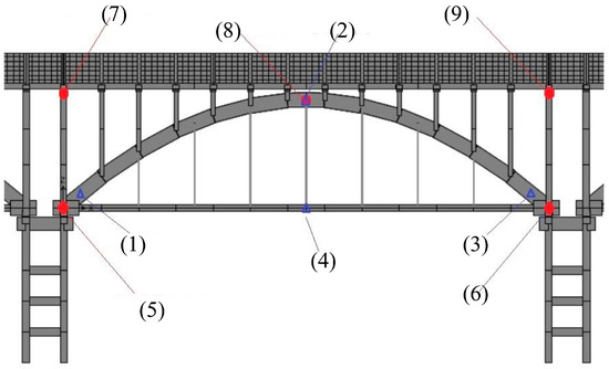 Analytical points in the 3D FE model correspond to monitoring locations in the real structure. (1)~(3) strains at the upstream end, top of the main arch ring, and downstream end of the main arch ring; (4) strain at the mid-span of the tension rod, (5)~(6) longitudinal displacements of the nodes at the upstream, and downstream ends of the composite tied-arch; (7)~(9) vertical displacements of the nodes at the upstream end, mid-span, and downstream end of the main arch ring.