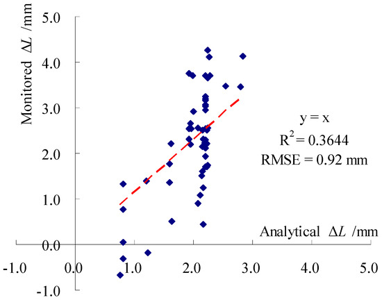 The relationship between the monitored and regression values of ΔLdex during the aqueduct operation from 9 March 2024 to 2 May 2024 is shown in Figure 7, which has a good correlation with an R-square of 0.9434 and a RMSE of 0.81 mm. It is also found that the t-statistic for ΔTdex (25.11) is higher than that for Wdex (6.36), indicating that ΔTdex is statistically significant.