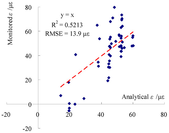 Taking the temperature-effect-excluded εdav specified in Figure 21 and Figure 22 as the “monitored” ε under only water load for each rod and the strains obtained from the 3D model under daily average water levels during operation as the corresponding analytical ε, the relationships between those two parameters for both rods are shown in Figure 28 and Figure 29. The variation trend of the monitored ε of the left rod (not exposed to direct sunlight) under water load is generally consistent with the analytical ε, and the correlation has an R2 of 0.6640 and a relatively low RMSE of 8.6 με, whereas, for the right rod under direct sunlight exposure, there is a higher degree of dispersion between the monitoring results and model predictions.