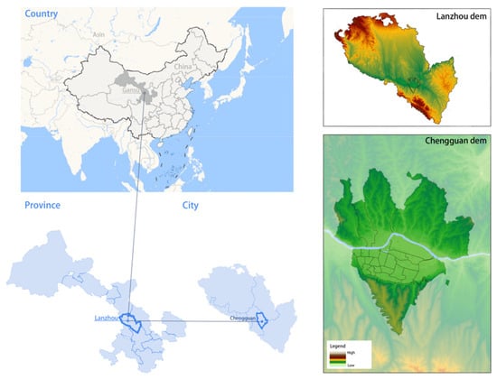 Lanzhou is located in the northwestern part of China and represents the geometric center of the Chinese mainland. Its geographical coordinates range from 102°35′58″ to 104°34′29″ east longitude, and from 35°34′20″ to 37°07′07″ north latitude. As the capital of Gansu Province, Lanzhou functions as the political and economic hub of the province, comprising five urban districts and three county-level cities. The total land area of the city is approximately 13,085.6 square kilometers []. As reported in the “Lanzhou Statistical Yearbook (2024)”, the permanent resident population of Lanzhou reached 4.4251 million by the conclusion of 2023. The city is characterized by a temperate semi-arid climate and comprises four distinct landform types: mountains, hills, intermountain basins, and river valleys. The topography exhibits a general gradient, with higher elevations in the southern region and lower elevations in the northern area. Additionally, the rivers within the city are part of the Yellow River Basin, contributing to its classification as a typical strip-shaped city [,].