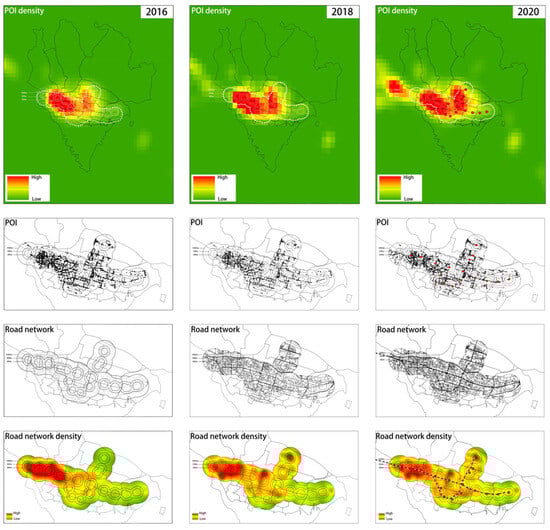 In the examination of the spatial distribution logic of POIs, we utilize kernel density analysis as a methodological approach to visualize both POIs and road networks. Kernel density analysis is commonly employed to depict variations in spatial density values and is effective in representing the spatial distribution patterns associated with point and line elements. The calculation formula is articulated as follows: