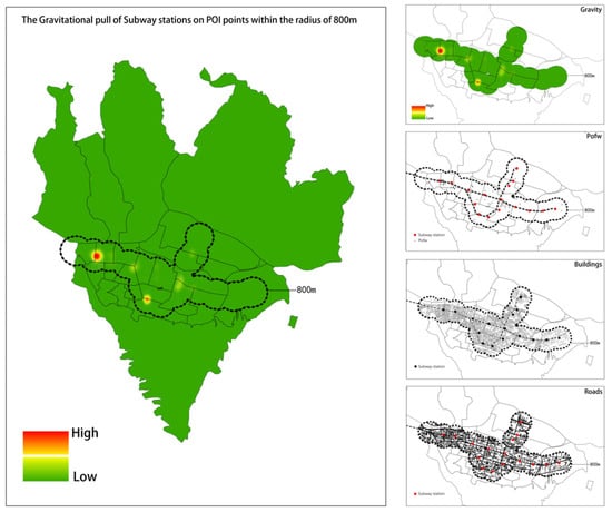 Analysis of Figure 3 reveals that the most significant alterations in POI locations and the surrounding road network occur within an 800-m radius of rail transit stations following their establishment. Consequently, high-visit POIs situated within a 15-min walking distance, or 800 m, from station entrances were selected for the calculation of the urban gravity model, as illustrated in Figure 4. By integrating the road network, building footprints, and the distribution of POIs within the study area, it can be inferred that the impact of metro stations extends beyond merely attracting the aggregation of POIs. Rather, the influence of these stations is characterized by their ability to draw high-quality, high-visit commercial POIs into concentrated clusters. These POIs serve as focal points of regional vitality; however, their individual significance may diminish when their distribution becomes excessively concentrated. The density of the road network and building structures positively correlates with the gravitational pull of the stations; however, the mere aggregation of POIs does not inherently demonstrate the attractiveness of the stations. While POIs may cluster, the presence of densely populated buildings and road networks is equally crucial in enhancing the influence of the stations. Typically, attractive stations are characterized by a relatively high density of high-visit POIs, buildings, and road networks within an 800-m radius. Furthermore, high-visit POIs are predominantly located between stations that experience substantial passenger traffic. As depicted in the figure, the distribution of the road network at the northern and southern extremities of the study area is relatively sparse, constrained by the river valley terrain and the Yellow River. This results in a lower density of buildings and presents challenges for the emergence of high-visit and high-gravity POIs in these regions, thereby limiting the attractiveness of the metro stations in these areas.