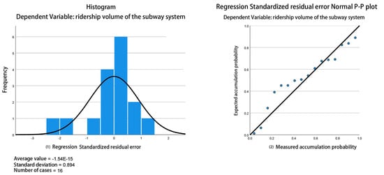 As depicted in Figure 5, the histogram (1) exhibits an approximately bell-shaped distribution, with minor deviations attributable to the influence of a limited number of stations. The P-P plot (2) reveals that the majority of metro stations align with the expected distribution, as the points predominantly form a near-straight line, with only slight deviations at the extremes. These observations collectively indicate that the residuals of station hotness adhere to a normal distribution, a condition that sufficiently validates the normality of the sample data despite the small sample size. Figure 5 further demonstrates the robustness of the regression model, confirming that the number of highly visited POIs within an 800-m radius of metro stations, the overall hotness, and the count of catering POIs serve as significant explanatory variables for metro station hotness.