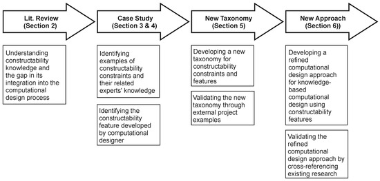 The outcomes of this research include a new taxonomy for constructability constraints and a corresponding computational design approach. These outcomes are validated through cross-referencing with the existing body of knowledge. As outlined in [62,63,64], cross-referencing is a suitable validation method for this research because it evaluates the alignment and consistency of the findings with established knowledge in the field.