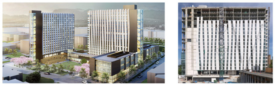 Architectural design concept before the computational design for constructability (left) ©Perkins+Will; Constructed façade after the computational design for constructability (right) ©BIM TOPiCS Lab.