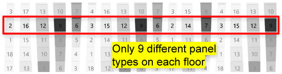 Upon consulting with practitioners, the designers settled on vertical displacements ranging from 3 to 7 floors between adjacent panel bays. Moreover, for constructability reasons, they ensured each displacement was a whole number of floors, ruling out shifts like 3.5 floors. By embracing such constraints, each panel bay mirrored the panel sequence of other bays, with the sole distinction being the commencement with a different panel type. Figure 6 displays the positioning of panels across different bays and the vertical displacement between them, which can be identified via diverse color shades and corresponding numbers.