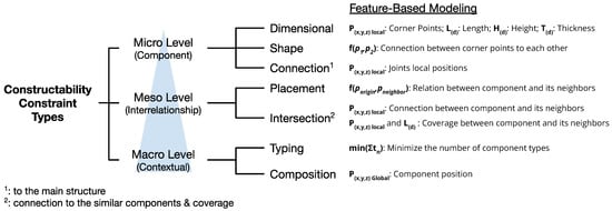 As Raviv et al. [6] suggest, most constructability challenges during the design phase arise due to (1) the lack of constructability knowledge; (2) insufficient information; and (3) poor coordination with other disciplines. These issues become particularly crucial in traditional project delivery models, where computational designers often work in silos, bearing primary responsibility for resolving constructability challenges. Even in more collaborative projects, the absence of a systematic approach for receiving and incorporating constructability knowledge into the computational design process often leaves outcomes dependent on the personal interpretation and understanding of individual designers. To address this issue, some efforts have been made to introduce methods ensuring that necessary experts’ knowledge is considered during the design process. For instance, refs. [7,8] propose methods for establishing checklists for constructability criteria to enhance the quality of the computerized design process using BIM, while [9,10] focus on general constructability considerations incorporated into the design for manufacturing and assembly (DfMA) process. However, as noted by [11], the existing research still lacks methods that integrate constructability knowledge as a driving factor in the computerized design process. Therefore, it is essential to explore methods for systematically integrating experts’ knowledge into the computational design process. For this purpose, the feature-based modeling (FBM) approach has shown the potential to be a viable tool for integrating the necessary knowledge into the computational design processes [12]. However, despite the great potential of FBM approaches to convey expert knowledge into the design process and its proven success in other engineering fields, only a few AEC studies have detailed how to develop such features and implement them in models computationally [12,13,14,15,16,17]. Furthermore, a systematically structured method for formalizing and developing design constructability constraints and features for prefabricated building components is still lacking.
