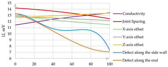 - The geometric parameters of the TO: The technological tolerance for the thickness of the tested copper busbars is 1 mm, respectively, and the tolerance for the thickness of the soldered joint is ±2 mm. The measurement results of such joints are affected not only by the thickness of the conductive material in the TO but also by the gap between the TO and the installation plane of the ECP, exponentially reducing the penetration depth of eddy currents. Therefore, the existing geometrical tolerances of the TO impose significant limitations on the probe design [33].