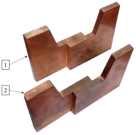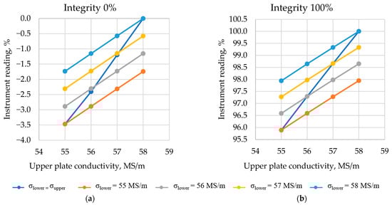 - The electromagnetic parameters of the TO material: ECP signals are sensitive to variations in the electrical conductivity of the TO material. Therefore, a difference in the values of electrical conductivity for the upper and lower copper plates of the TO distorts ECP measurements. The variation in electrical conductivity in the considered application can be caused mainly for two reasons: a technological variation in the electrical conductivity of the upper and lower plates of the TO and temperature changes affecting the electrical conductivity value of the TO metal [36,37,38].