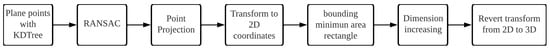 The estimation of the equation of the plane defined by the set of points of the set is carried out in order to continue the process. By using a RANSAC algorithm [12], an equation of the plane is obtained, in which the points are projected and from which its normal vector is extracted. Afterwards, by obtaining the normal vector of the plane, the reference system of the plane is changed to work on the set of projected points in 2D coordinates, removing the coordinate that would correspond to the depth, as shown in Figure 3.