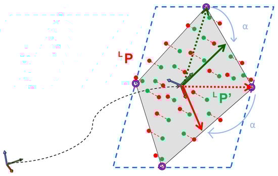Finally, the minimum area rectangle that surrounds this set of points is calculated. For this purpose, is repeatedly rotated by an angle , obtaining the maximum and minimum coordinates of each axis that would determine a rectangular polygon containing the rotated set . The rectangle of minimum area will have an orientation , where corresponds to the rotation of in which the rectangular polygon that bounds the points minimizes its area, this being area calculated from the maximum and minimum coordinates in x and y. Lastly, keeping the orientation of the bounding rectangle of minimum area and maintaining its center fixed, the width and height dimensions of the rectangle are increased, if necessary, by making them equal to those of the actual reference pattern. Once the 2D corner positions are known, the previously applied inverse transform is performed to obtain the 3D coordinates of the global system, finally obtaining the 3D coordinates of the corners of the rectangle.