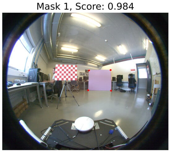 The first step is to find the rectangle corners in the image. To accomplish this, Segment Anything [25] is used to segment the rectangle. Once the rectangle mask is obtained, a small dilation is applied to this mask to effectively extract the entire rectangle. After that, the k-means algorithm is applied to divide the points into four groups in order to obtain the points of the mask contour farthest from the centroid. Via RANSAC, selecting for each corner one of the points of its group, the points that maximize the sum of the six possible distances between them are obtained. Finally, a small window around each point is selected, and the final characteristic point is the mean between the point extracted with RANSAC and the point from the contour of the mask inside the window, whose distance to the corner of the window closer to the center of the mask is maximum.