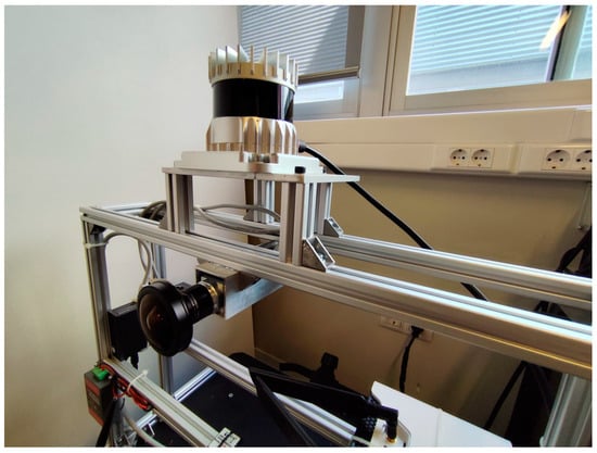 To conduct the experiments, a Basler a2A2600-20gcBAS (https://docs.baslerweb.com/a2a2600-20gcbas, accessed on 16 January 2025) camera was used, with a FE185C057HA-1 fisheye lens with a field of view of 185° and an Ouster OS1-128 (https://data.ouster.io/downloads/datasheets/datasheet-revd-v2p0-os1.pdf, accessed on 16 January 2025) LiDAR with 128 channels, a range of view of 45°, and up to 90 m range. The setup used in the experiments is shown in Figure 7.