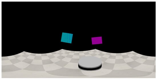 A simulation was carried out using CoppeliaSim (https://www.coppeliarobotics.com/), as shown in Figure 8, in order to test the method in a controlled environment. The simulation consists of a LiDAR sensor, an ideal spherical image sensor with a horizontal field of view of 360° and vertical field of view equal to 180°, and two rectangular polygons with the same dimensions as the ones used in the real environment experiments.