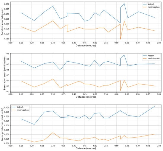 In Table 1, the results of the calibration in the simulation environment are shown. Despite the fact that the minimization method is directly based on the minimization of the mean pixel error, the results are not far from those of the minimization method. The maximum difference in the results appears in the translation error: the error produced by the proposed method is more than twice that of the minimization method. While the minimization method takes more time to solve the optimization equation, the proposed method is much faster and provides similar results, the mean pixel error being the most important metric to evaluate the quality of the calibration.