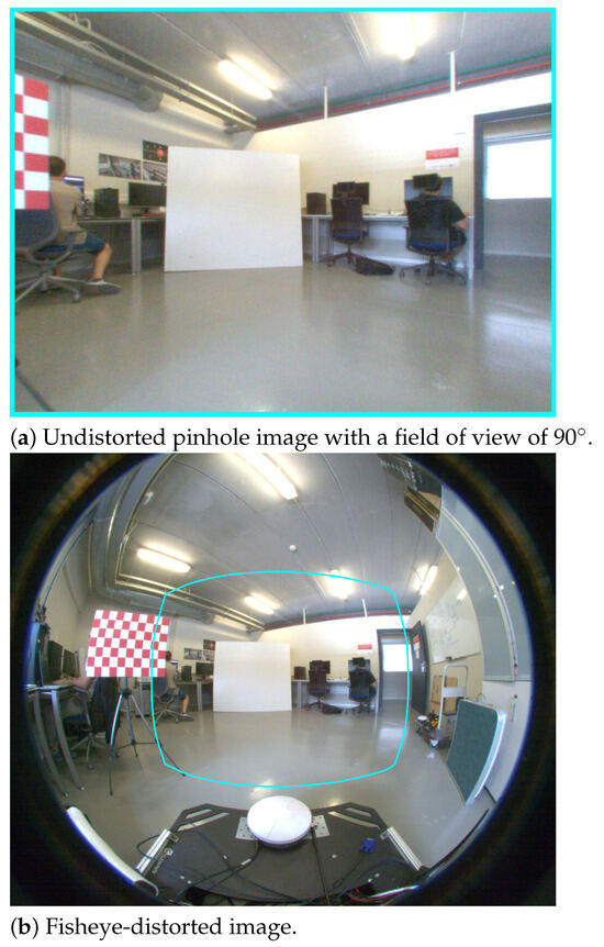 Figure 11 shows sample images of the real environment experiment with the two rectangles of different sizes. Initially, Figure 11a is an undistorted pinhole image with a field of view of 90°, while Figure 11b is a fisheye-distorted image where the extra field of view is clearly visible. Figure 11a is shown just for comparative purposes. In the present work, only fisheye images are used.