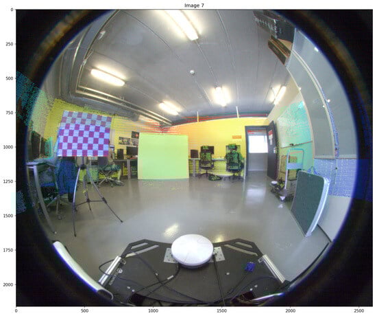 For the real environment experiments, a set of 11 images and point clouds was used. The resolution of the fisheye images is 2600 × 2160 pixels, so the resolution of the spherical image, where the error in pixels is measured, is 4320 × 2160 pixels, which is double the size along each axis compared to the spherical image used in the simulation. The positions of the LiDAR and the camera during the experiments remained fixed, while the calibration rectangles were placed at different positions and orientations. The position of the LiDAR is close to the camera, and the rotation between both systems is assumed to be minimal but never 0, and, as stated before, the ground truth transformation is not known.