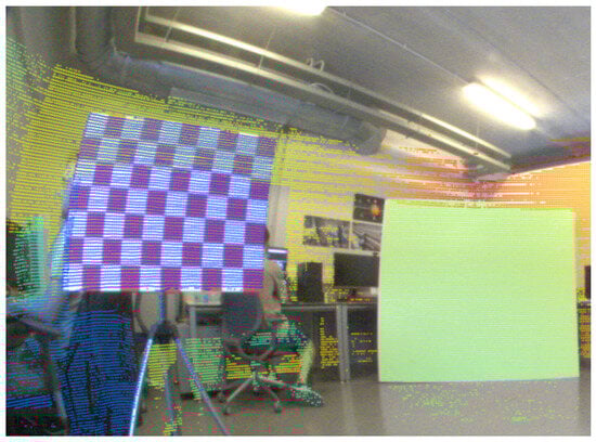 The projection of the LiDAR points onto the image is not perfect but accurate enough for the fusion of the information from both sensors. It can be seen in Figure 13 that the points are correctly reprojected onto the image, but some points obtained by the LiDAR sensor are placed over surfaces that they do not belong to. This occurs because the reference system of the LiDAR points is changed for the projection, so, from the perspective of the camera reference system, there will be further points obtained by the LiDAR that will stay behind other closer points sharing the same surfaces.