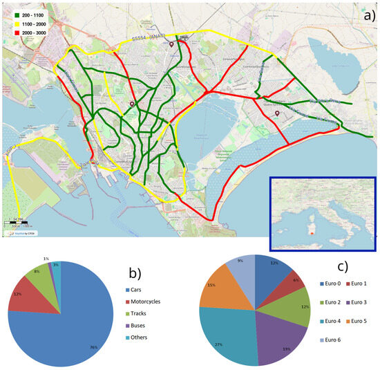 The ISTAT (Italian National Institute of Statistics) [31] big data warehouse was used to acquire vehicle information. Data are organized by theme, presented in multidimensional tables, and with a wide range of standard metadata. This dataset was used for a preliminary statistical analysis of vehicle types, environmental categories, Euro standards, fuel types, and CO2 emissions per kilometer. In Cagliari, 131,742 vehicles are registered, with 90,881 actively circulating or authorized to circulate with valid insurance. It is worth noting that Cagliari’s vehicle fleet is among the oldest in Italy, with approximately 50% of cars older than 15 years and engines classified below Euro 4. To estimate the spatiotemporal distribution of harmful emissions from city traffic, it is crucial to associate specific vehicle emissions with an estimated traffic flow distribution on Cagliari’s streets, at the highest possible resolution. A network of 167 low-cost, IoT-based sensors, managed by 98 stations, collects real-time data on circulating vehicles, classifying them as long, short, and motorcycles. These data are available through the Municipality of Cagliari’s API portal [32]. The system faces challenges, such as data gaps and occasional inaccuracies in station measurements, with metadata providing hourly updates on data reliability.