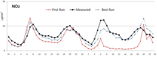 The average hourly distribution throughout the day for March and April 2019. The measured data exhibit a regular daily cycle with two peaks and two minima (average: 25.84; standard deviation: 14.78). The high standard deviation indicates significant variability within the sample. The black line represents the measured NO2 values, the blue line indicates the best run, and the red dotted line corresponds to the first run.