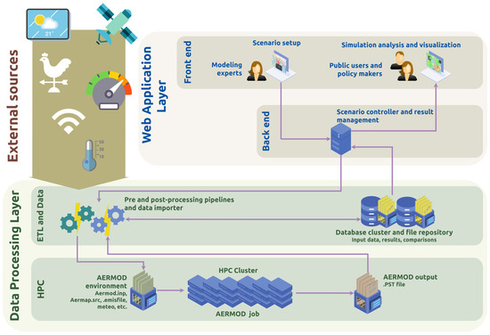 When a user designs a new scenario via the web interface, the back-end processes the request, initiating a pipeline to create the necessary input data for AERMOD based on user specifications. Once the data preparation phase is complete, the input environment is transferred to the HPC layer to execute the AERMOD model. Upon completion, the output is processed through another ETL procedure to load the simulated data into the database and generate heatmaps, which are stored in the file system repository. Finally, the scenario catalog is updated, making results available for visualization (GIS maps, graphs, and reports) in the front end.
