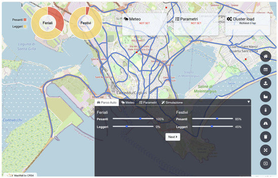 Vehicle Type Distribution: The interface enables changes in the composition of vehicle fleets by adjusting the percentage of vehicles in each emission standard category (Euro 0, Euro 1, Euro 2, etc.). These adjustments can be made for both working days and holidays, capturing different emission profiles based on vehicle age and efficiency standards.